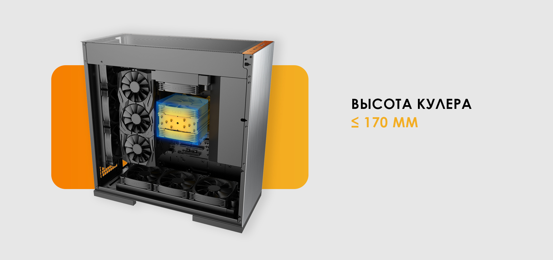 | Охлаждение (опционально) | Верхняя панель: 120 мм вент-р х 1, 120 мм радиатор Задняя панель: 120/140 мм вентр-р x 3, 420 мм радиатор (длина<470мм / толщина < 55 мм ), 360/280 мм радиатор (длина<400 мм / толщина < 65 мм ) Нижняя панель: 120/140 мм вент-р x 3, 360/280 мм радиатор (длина < 485 мм ) |